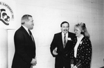 Description :DEUX HOMMES ET UNE FEMME SONT DEBOUT PRES D'UN MUR BLANC ET CONVERSENT.