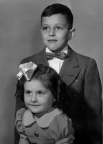 Description :DEUX ENFANTS. A L'ARRIERE DEBOUT, UN GARCON ET A L'AVANT UNE FILLETTE.