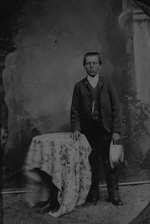 Description :PHOTO CABINET REHAUSSEE DE COULEUR, DE THEODORE OLIVIER DEBOUT, CHAPEAU A LA MAIN, PRES D'UNE TABLE AVEC NAPPE.