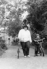 Description :UNE FEMME ET UN JEUNE GARCON MARCHENT A COTE DE LEUR BICYCLETTE.