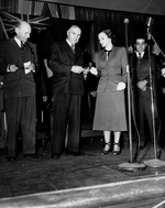 Description :ON APERCOIT A L'AVANT-PLAN A DROITE, MAURICE DUPLESSIS S'ADRESSANT AUX AUDITEURS DES STATIONS DE RADIO CBC ET CJAD SUITE A L'OBTENTION D'UN DOCTORAT HONORIFIQUE DE LA PART DE L'UNIVERSITE LAVAL. ASSIS A DROITE DE LUI ON PEUT ENTREVOIR JOHN S. ...