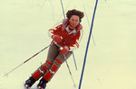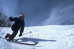 Description :JEUNE FILLE DESCENDANT UNE PENTE ET EFFECTUANT UN VIRAGE A LA FACON DU TELEMARK.