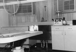 Description :VUE PARTIELLE D'UNE SALLE D'EMBAUMEMENT, SITUEE AU 79 BOULEVARD QUEEN NORD (AUJOURD'HUI 243). UN MUR EN PREFINI EST PERCE DE DEUX FENETRES AVEC STORES HORIZONTAUX. ENTRE ELLES, UN CRUCIFIX. SOUS LES FENETRES, UN COMPTOIR DIVISE AU MILIEU PAR U...