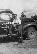 Description :PHILIAS, DEBOUT, LE PIED SUR LE MARCHEPIED DU CAMION, REGARDE L'OBJECTIF. LE CAMION PORTE EN EVIDENCE LES MOTS : CODERE LIMITEE FERRONNERIE 18 WELLINGTON SHERBROOKE.