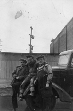 Description :LES EMPLOYES PORTANT SALOPETTES ET CASQUETTES SONT APPUYES SUR LE CAMION DE LA FERRONNERIE. CE SONT: GERALD ROBITAILLE, PHILIAS DUMAS ET ?.